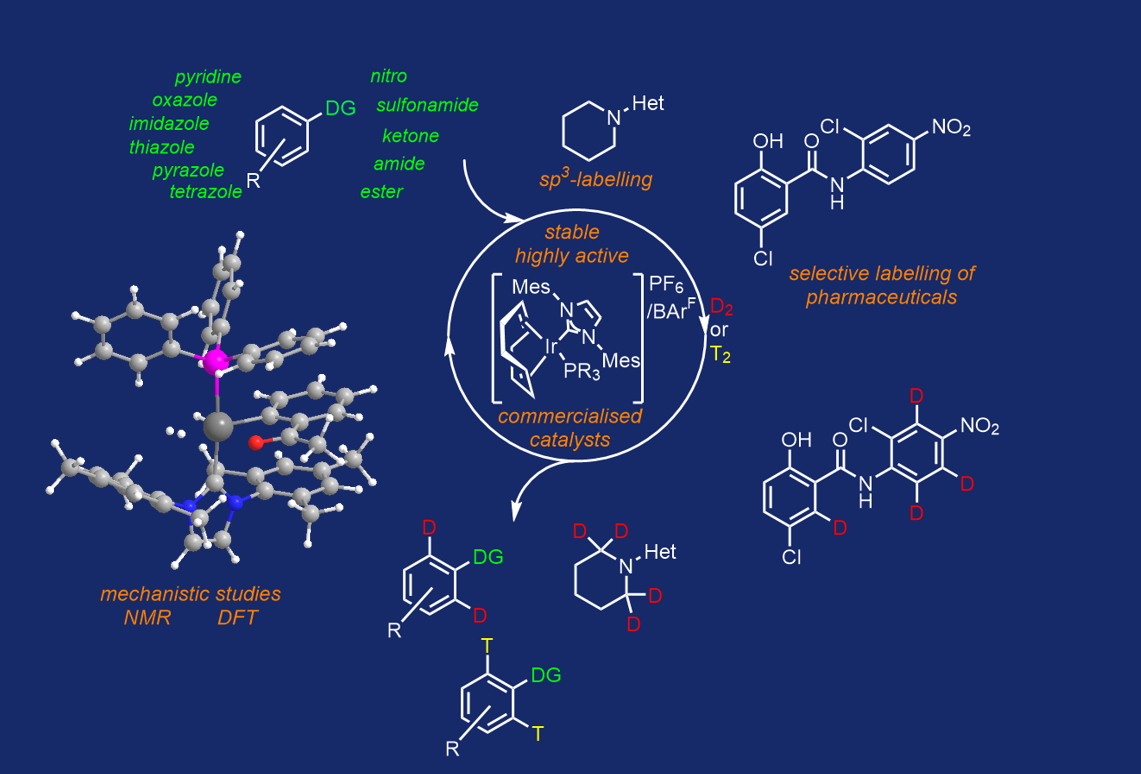 The Kerr Group Research team are now expanding their array of new catalysts developed within their laboratories, and attempting to deepen their mechanistic understanding of the iridium-catalysed hydrogen-isotope exchange reactions, as well as extending the application of the emerging complexes across an additional portfolio of important transformations in organic synthesis, such as hydrogenation, and C-C, C-N and C-O bond forming processes.