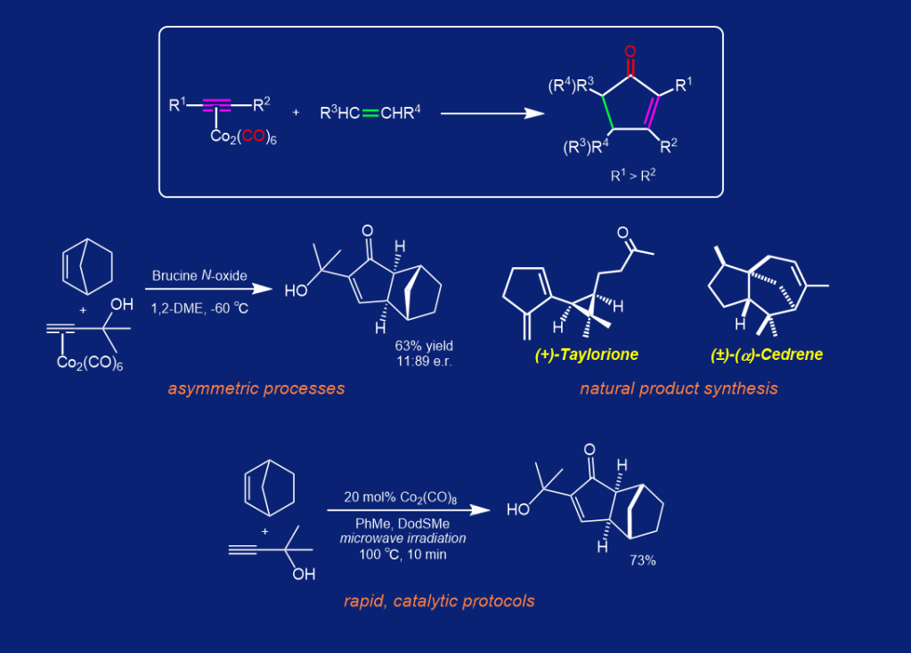 Research within our laboratories has been geared towards furthering the scope and synthetic utility of the Pauson-Khand (P-K) reaction. In addition to applying the reaction within the syntheses of a spectrum of natural products, such as Taylorione and Cedrene, we have contributed a number of additional developments within the P-K area, including studies on the first direct asymmetric P-K reaction, advances in solid supported promotion conditions, use of non-gaseous ethylene equivalents, investigations into controlling the regiochemical outcome of the olefin insertion step, development of efficient ultrasound promotion methods, and, more recently, a completely odourless and more economical sulfide-promoted protocol.